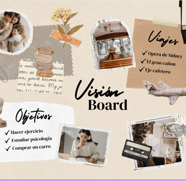 Un vision board (tablero de visión o mapa de los sueños) es un collage visual de imágenes, palabras y afirmaciones que representan tus metas, sueños y aspiraciones en diversas áreas de la vida (carrera, finanzas, salud, relaciones, etc.). Generalmente, se crea en una cartulina, corcho o de forma digital, y sirve como una representación tangible y artística del futuro deseado.